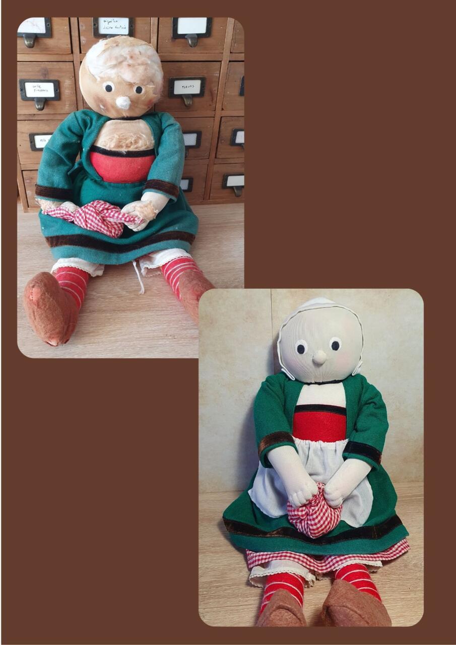 recoudre les oreilles. Remettre en place les articulations des bras et tête, nettoyage léger extérieur pour enlever la poussière.