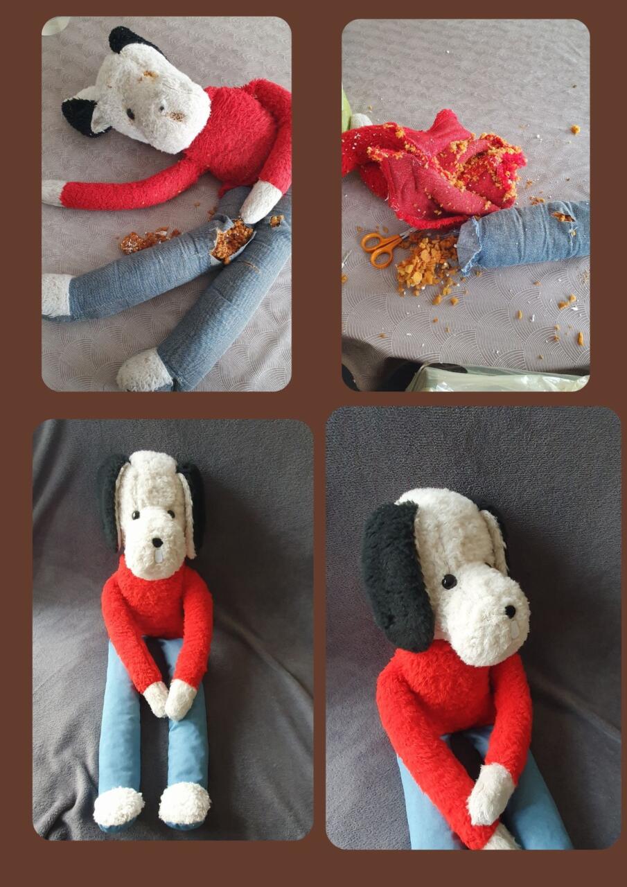 Changer la mousse très abîmée, nouveau pantalon, reprise des trous (environ 25) nouveaux yeux, nez, et langue.